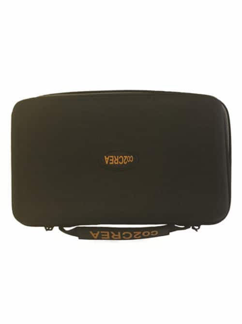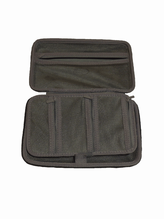 Hard-shell EVA storage case with pockets and zipper compartments.