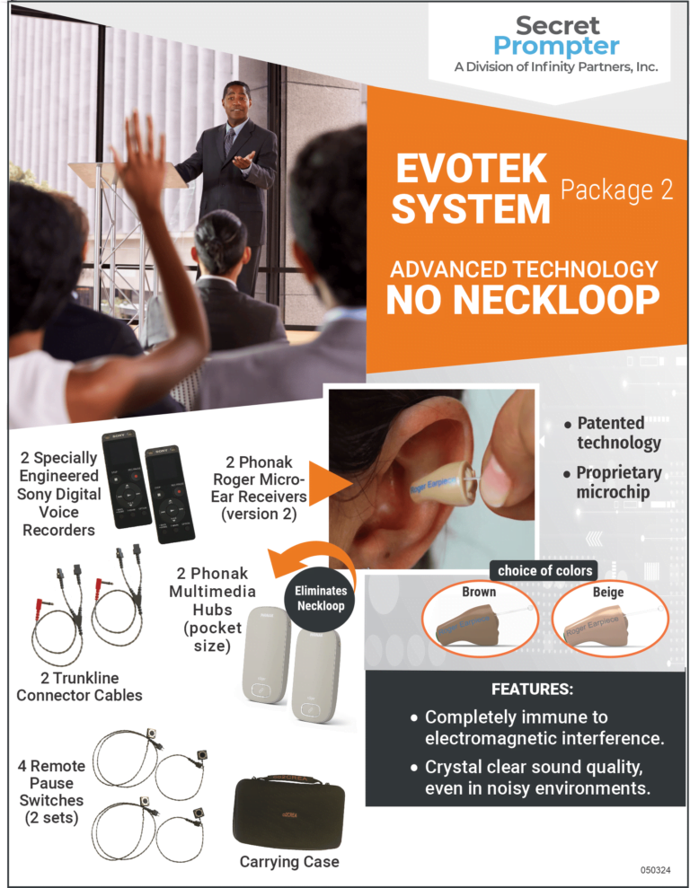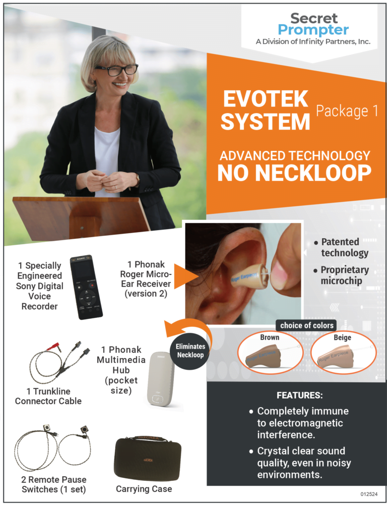 The Evotek System Package #1 is an all-in-one starter kit. It comes with everything you need to deliver a flawless presentation, right out of the box. This package is our cutting-edge covert ear prompting system.