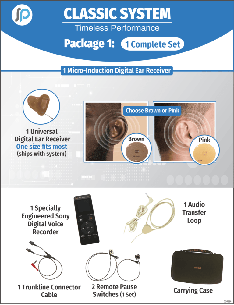 The Classic Package #1 is an all-in-one starter kit. It comes with everything you need to deliver a flawless presentation, right out of the box. This package is an introduction to our covert ear prompting system.