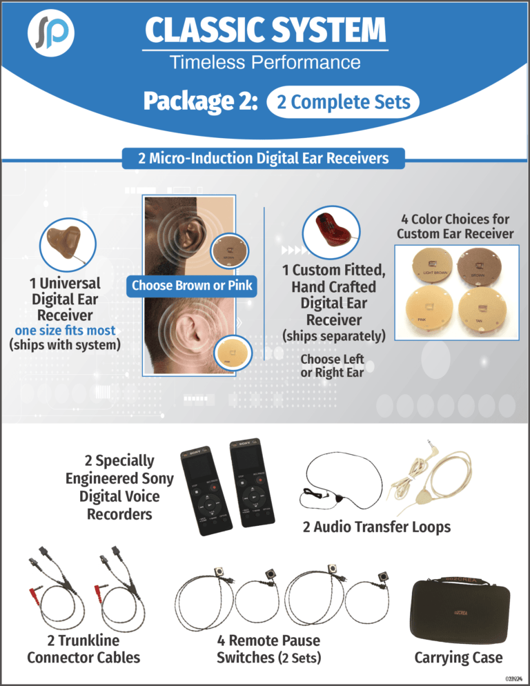 IMPORTANT NOTE: An universal fit micro-induction digital ear receiver is shipped with this package. You can start using the system right out of the box while your custom ear receivers are being manufactured. It takes 6 -14+ days to handcraft the custom ear receivers and they are shipped separately, at a later date.